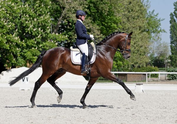 She has competed succcesfully at PSG and I1 getting both her qualifying scores for regionals already. She competed her first CDI in the PSG and I1 successfully at WEC . Training all the Grand Prix movements. Has super pirouettes, piaffe and passage and is developing her lines of one tempis. She teaches you to be a quiet and clear rider while being forgiving. She is never nasty or naughty in work or on the ground. No buck, rear, bolt. Easiest thing to handle on the ground. Perfect for farrier, vet, tying, clipping, trailering, showing by herself. I cant say enough good things about this horse. Everywhere she goes people fall in love with her.. I have bred and raised this mare so I know everything about her. She even knows how to bow. Requires some maintenance to keep her comfortable. A good home that will do what is needed is the most important to me. Easily works a full training program if properly maintained.